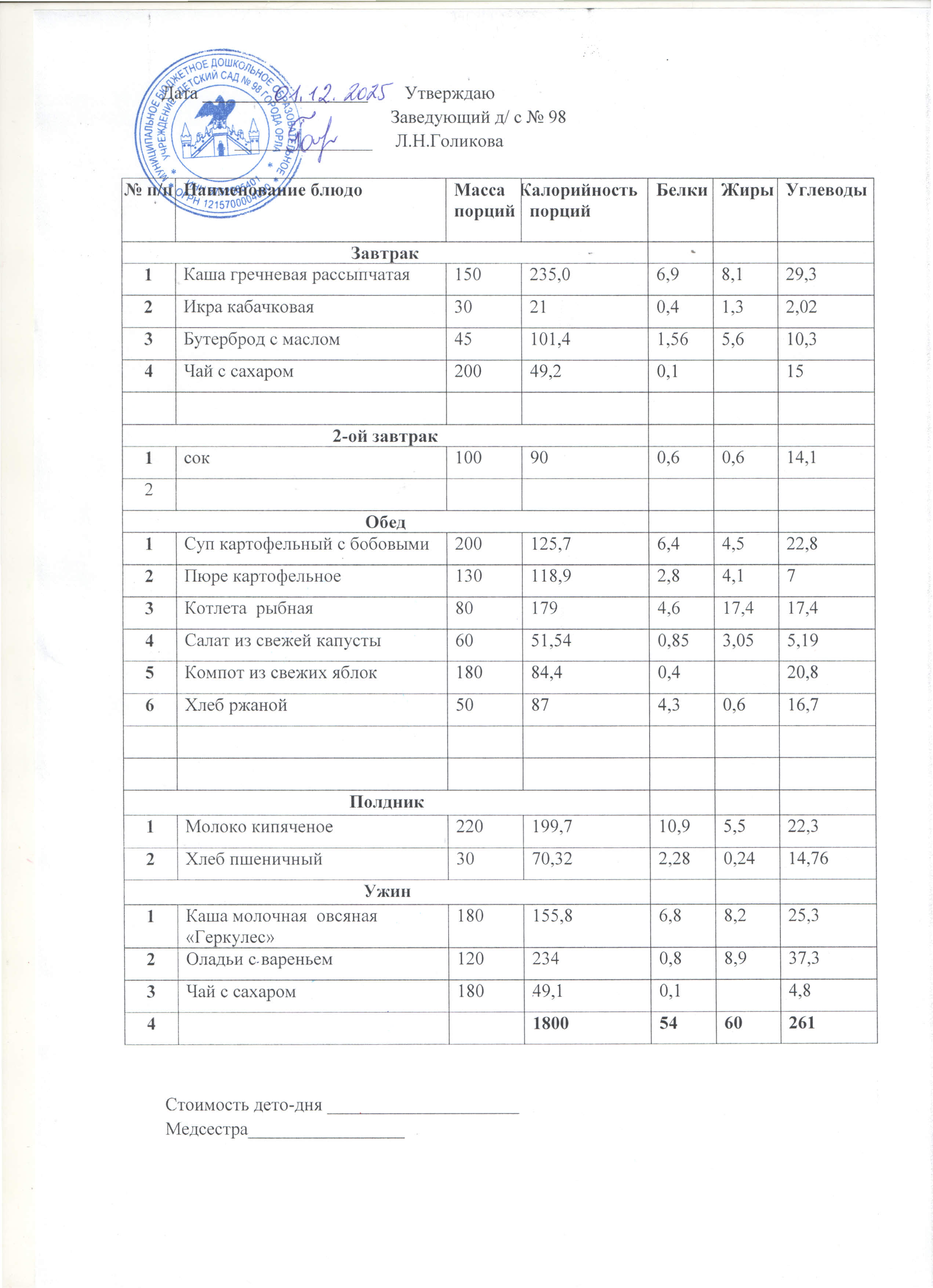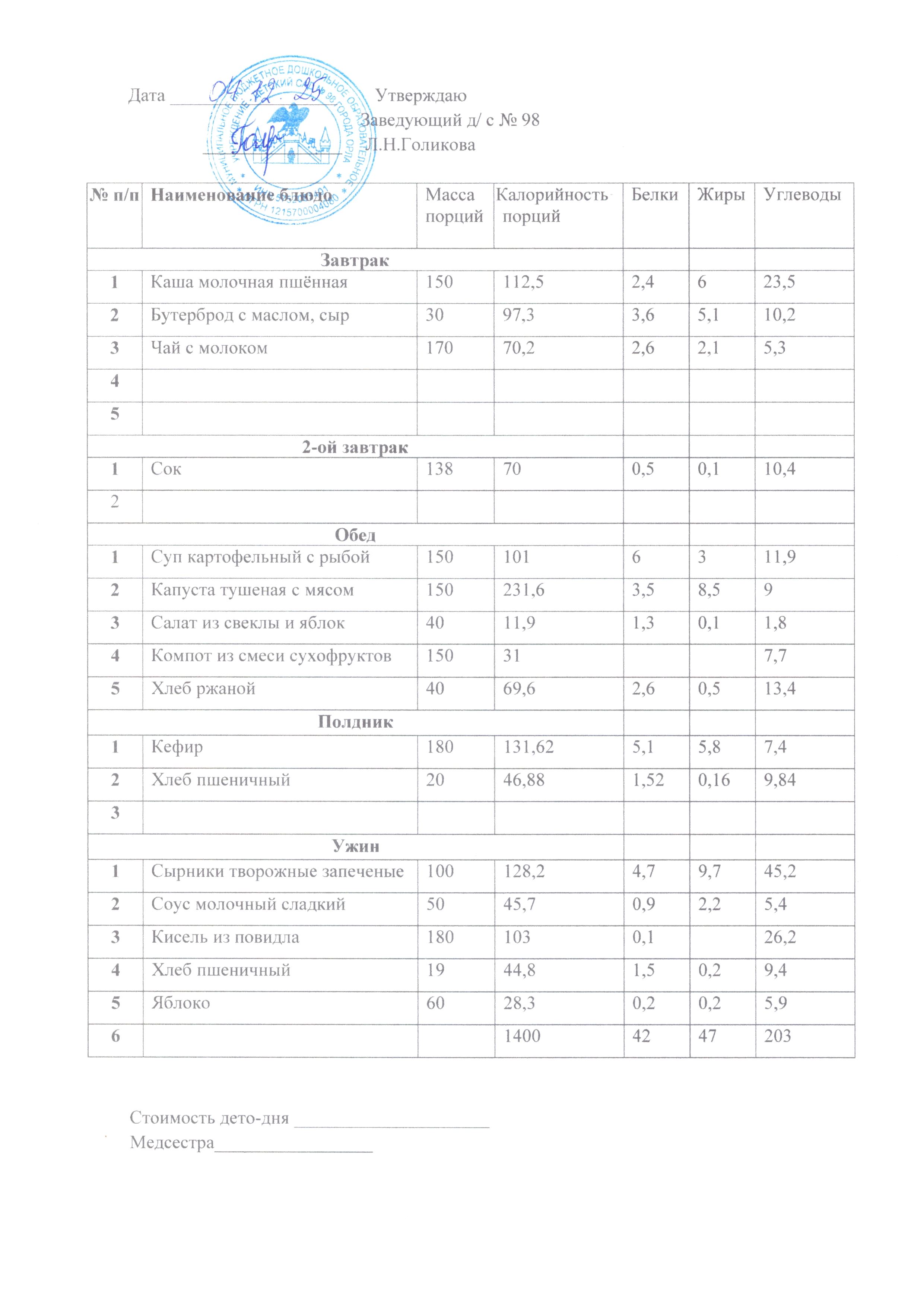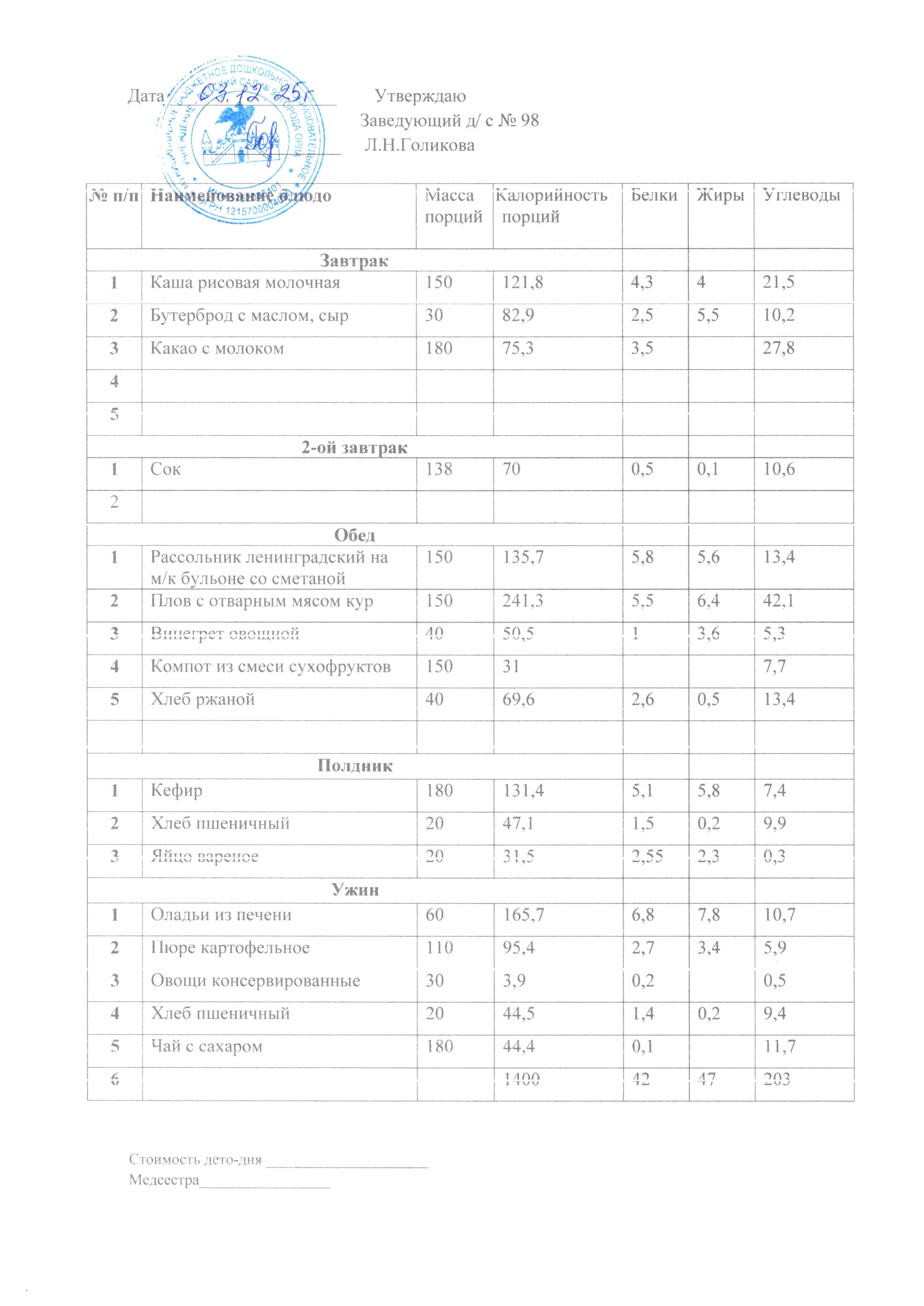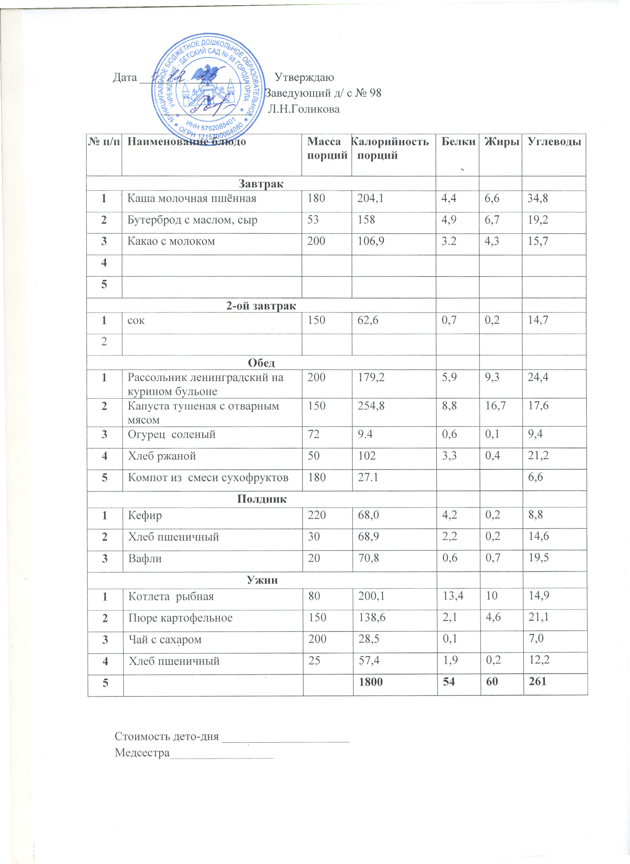 Меню ежедневного горячего питания в МБДОУ № 98 г. Орла