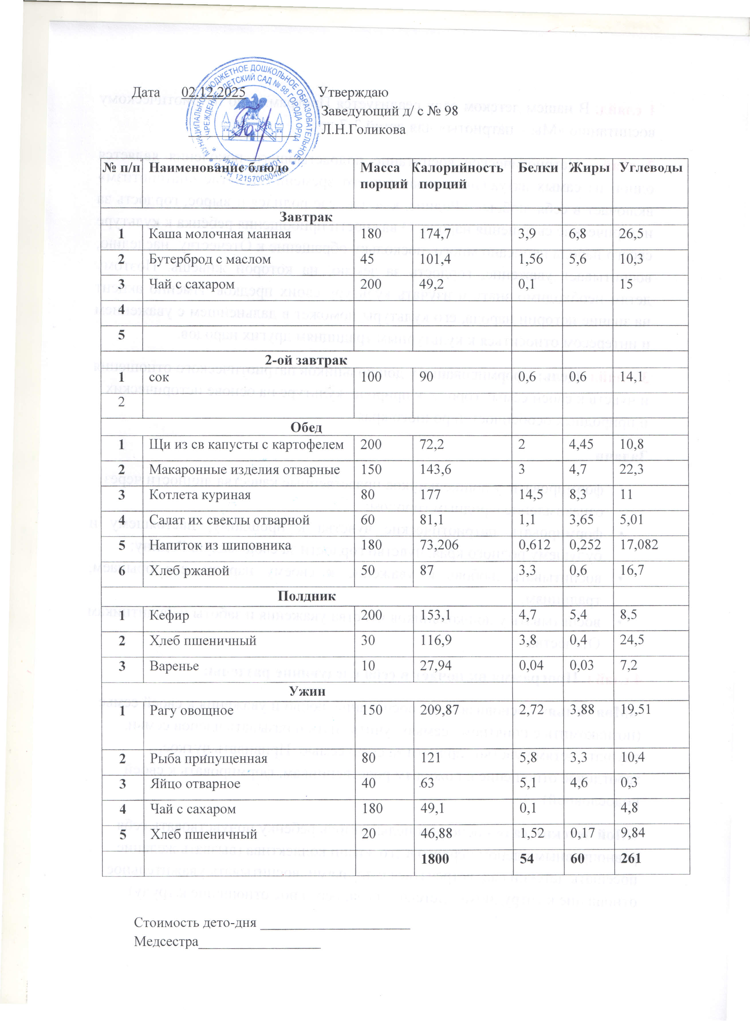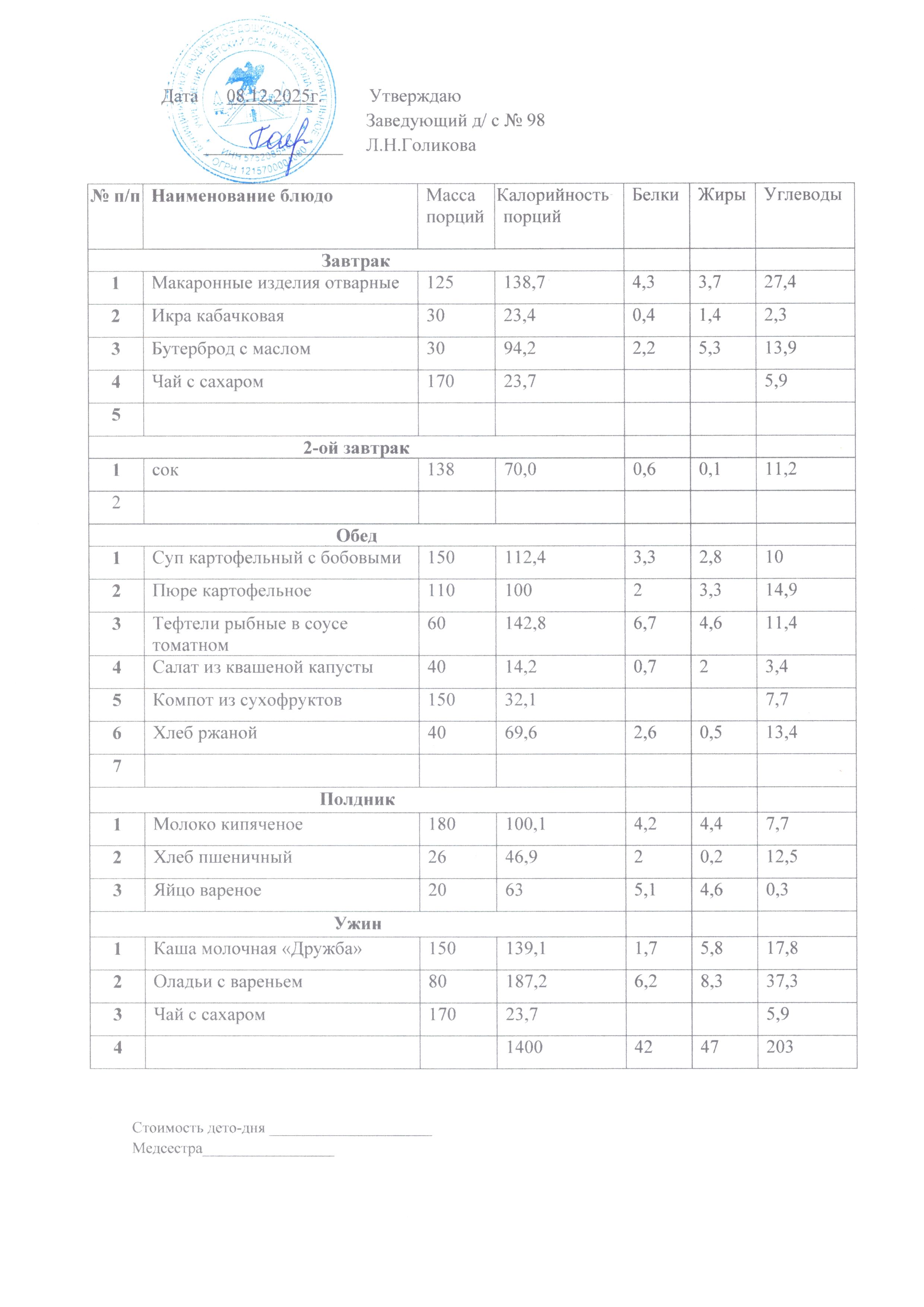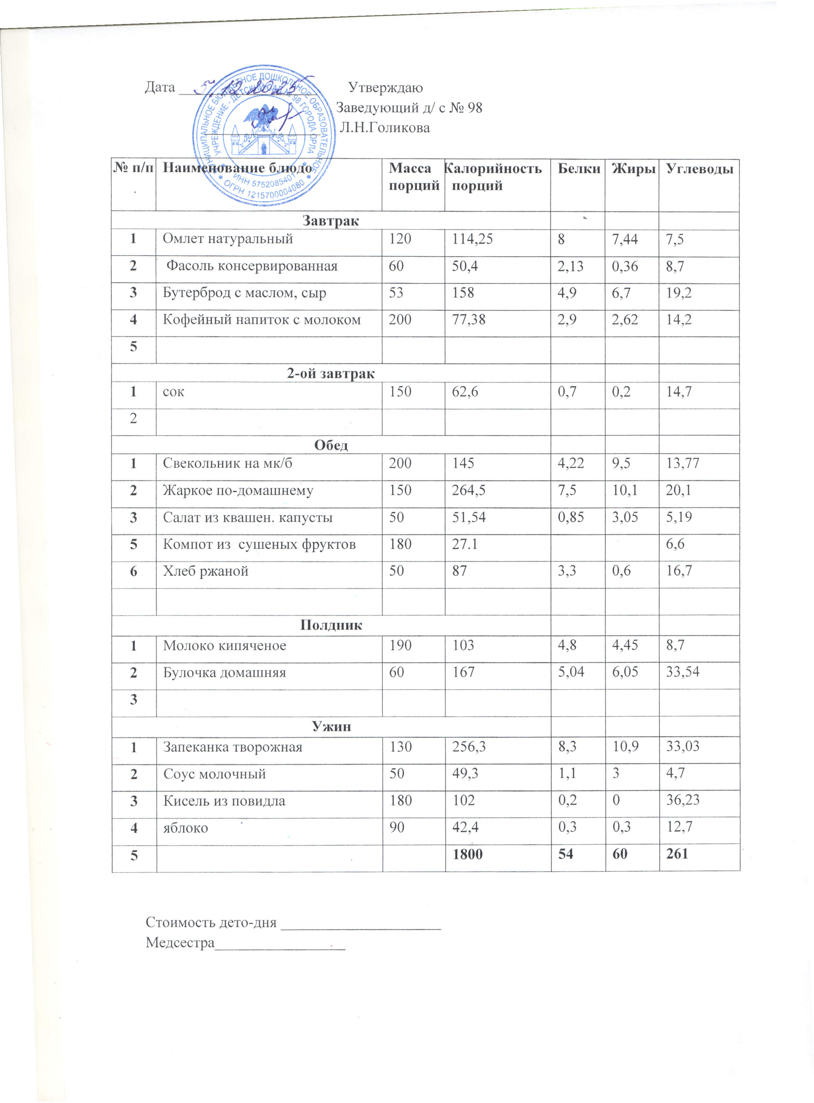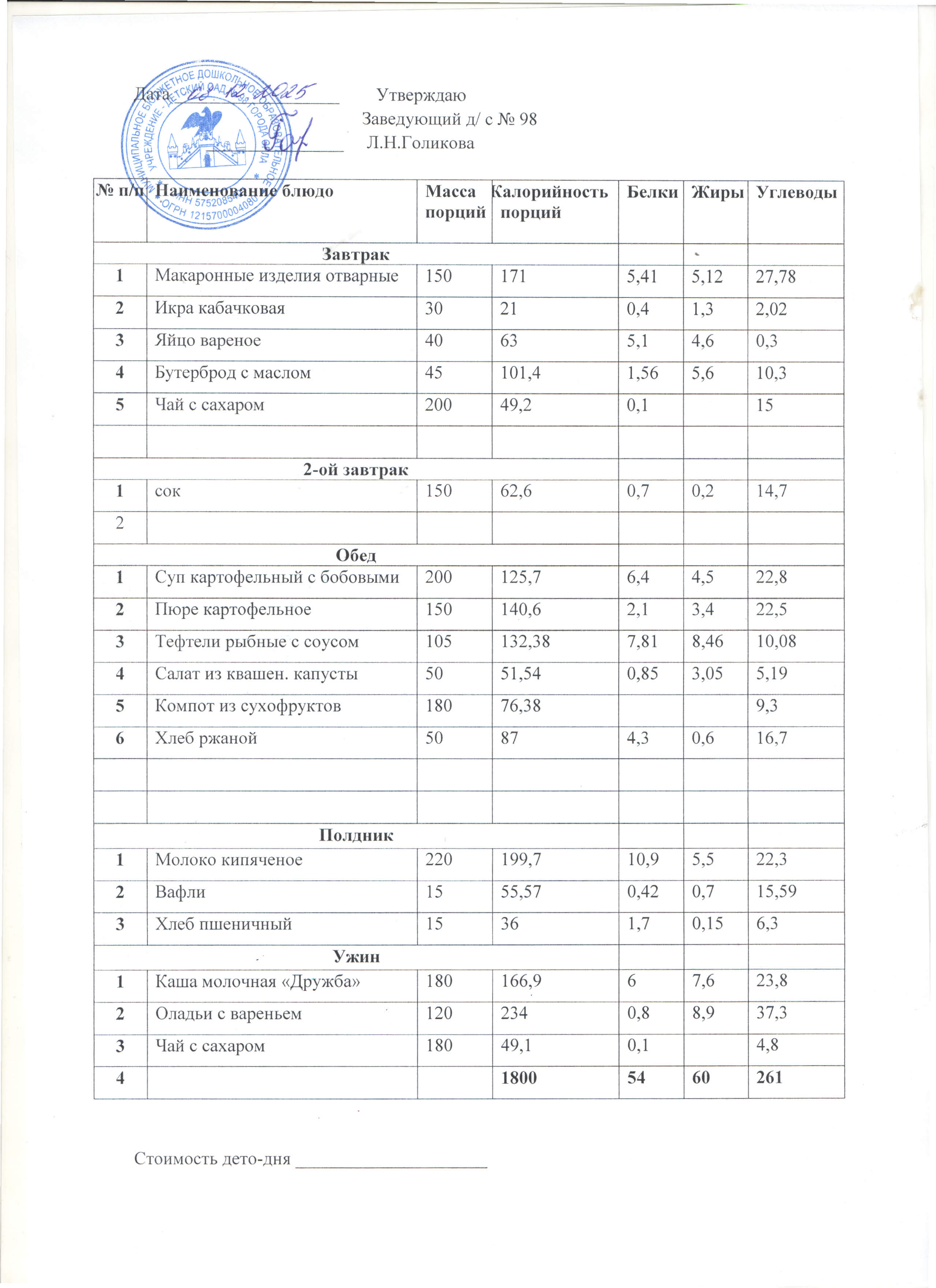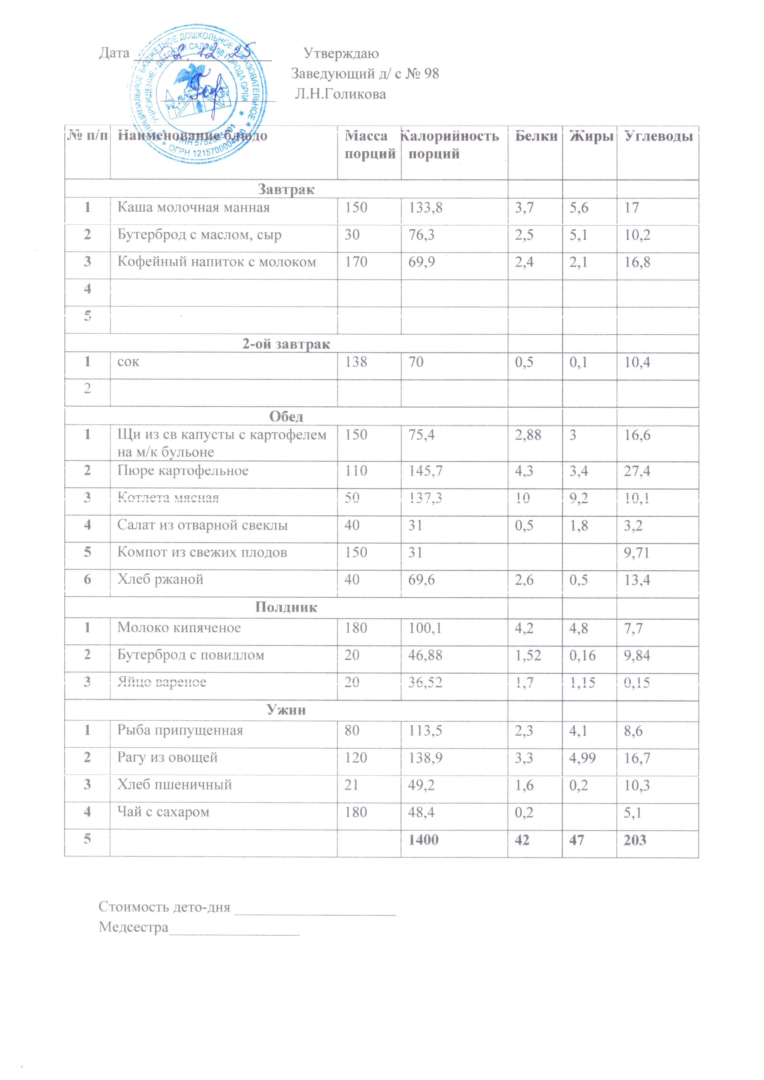 Меню ежедневного горячего питания в МБДОУ № 98 г. Орла