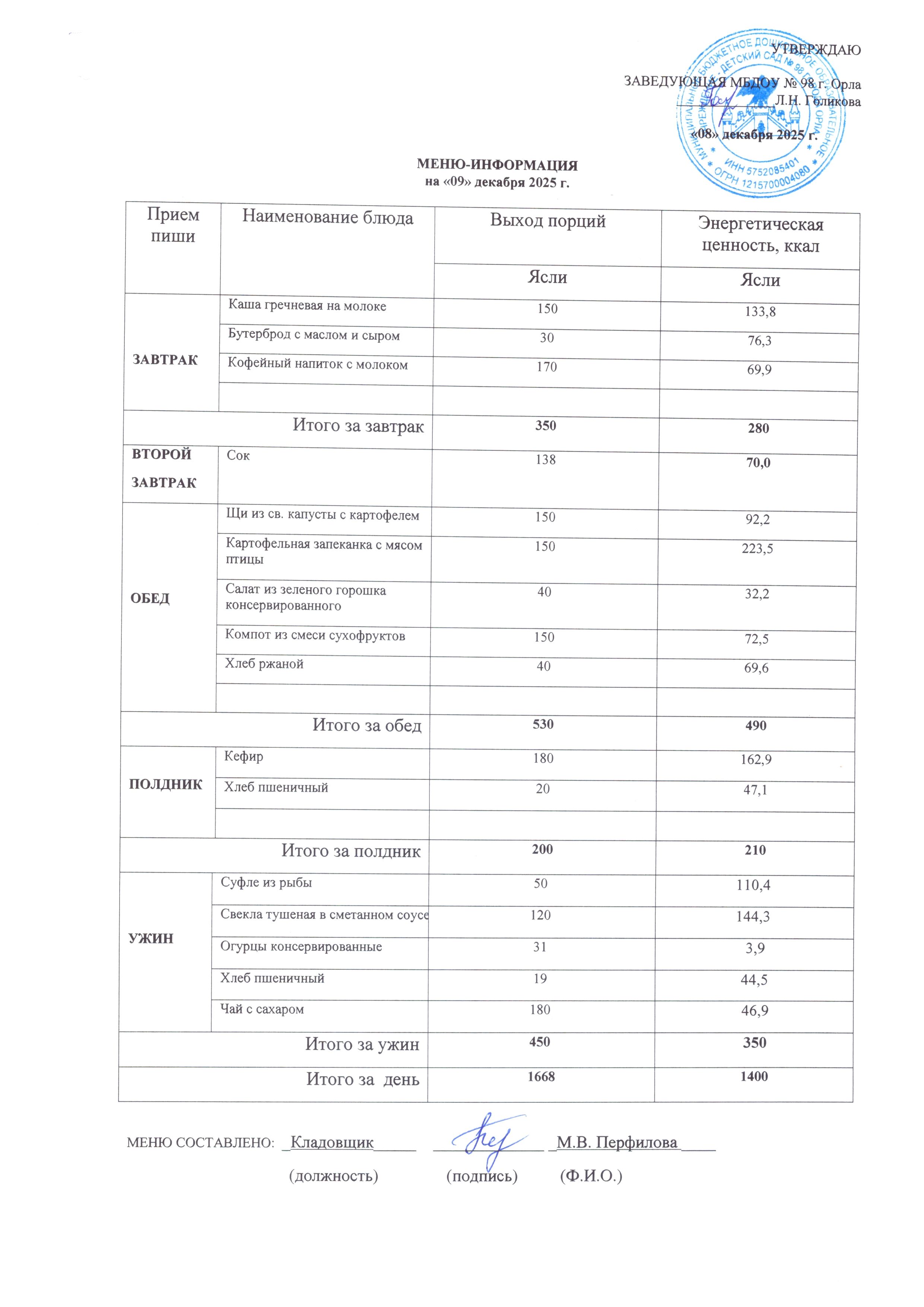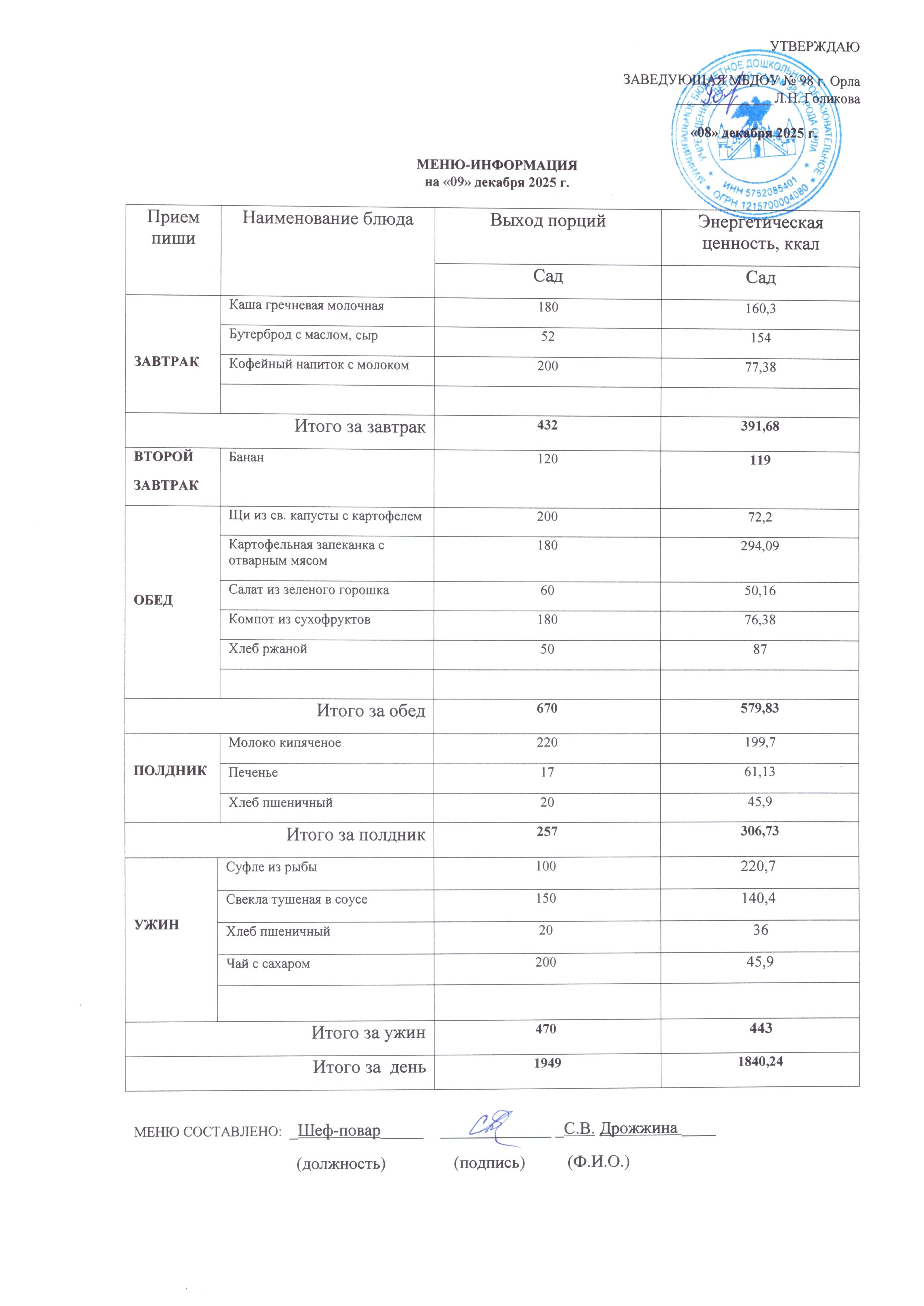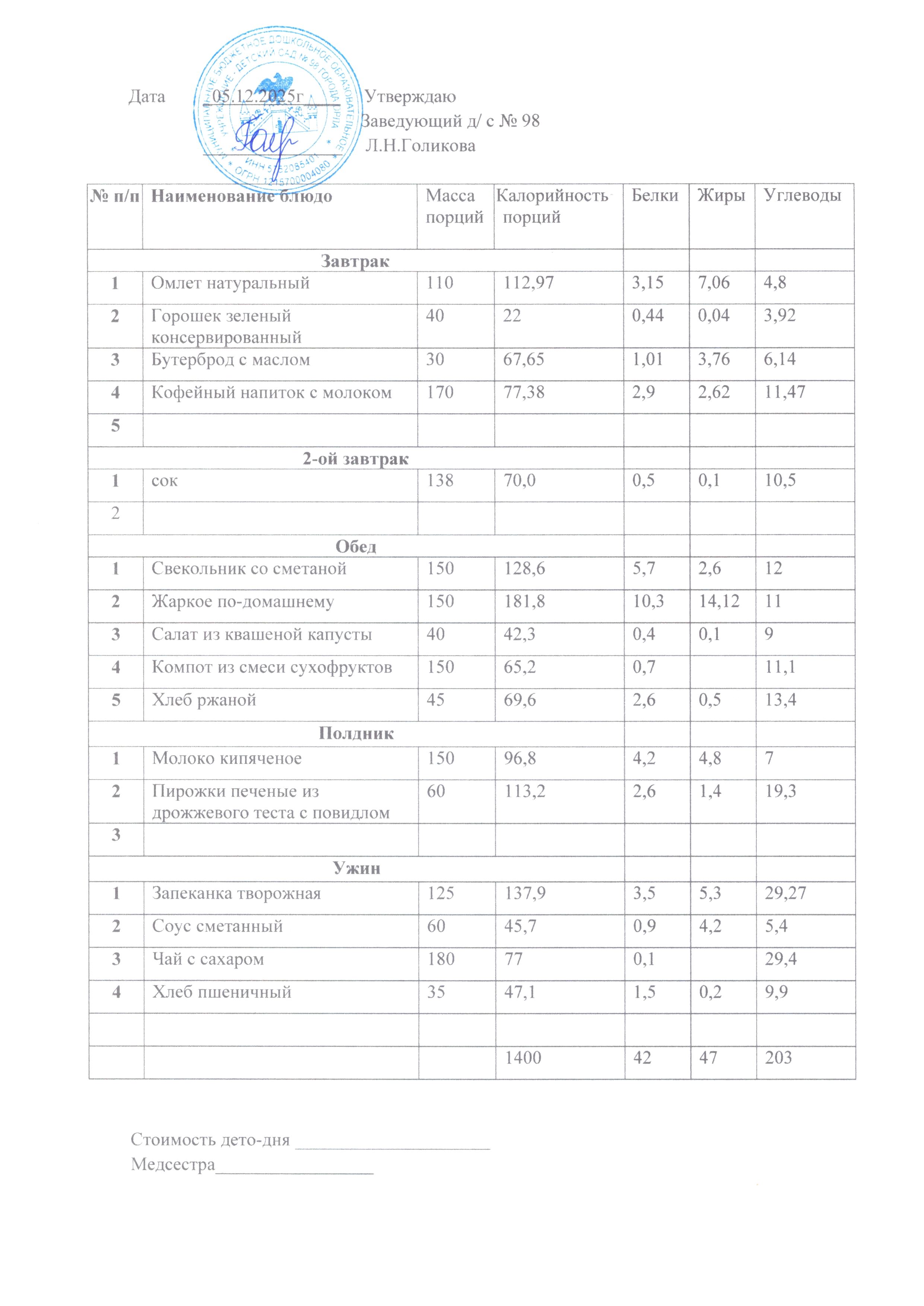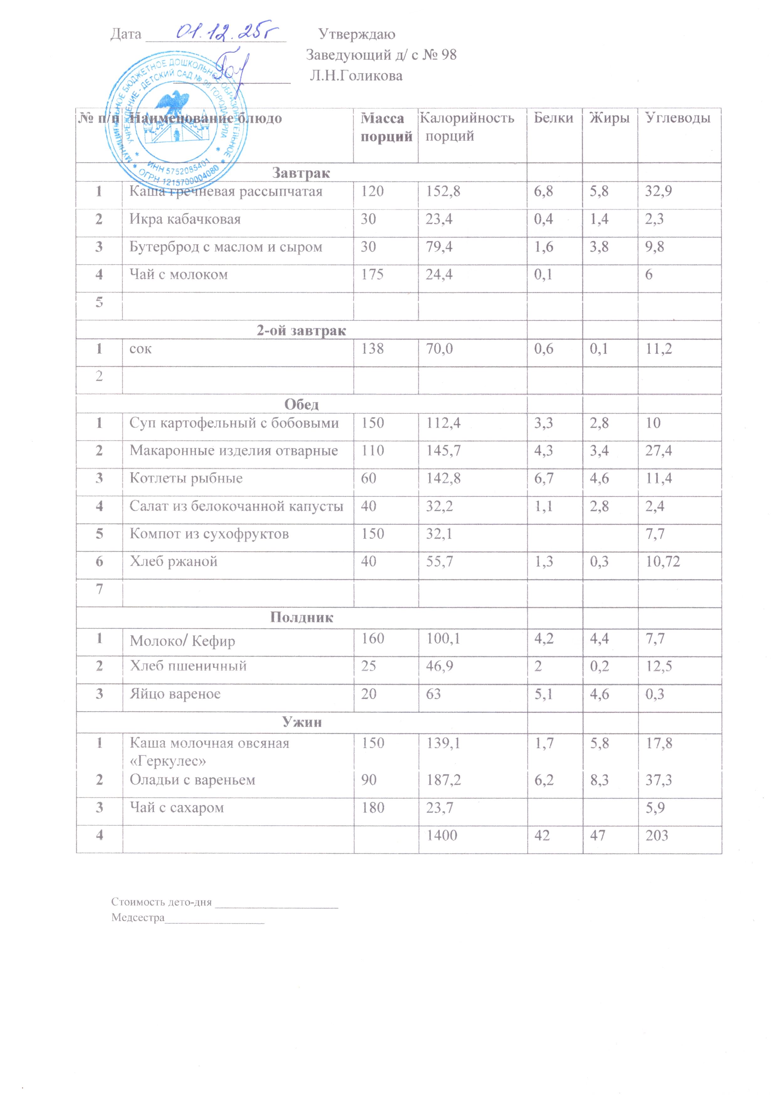 Меню ежедневного горячего питания в МБДОУ № 98 г. Орла