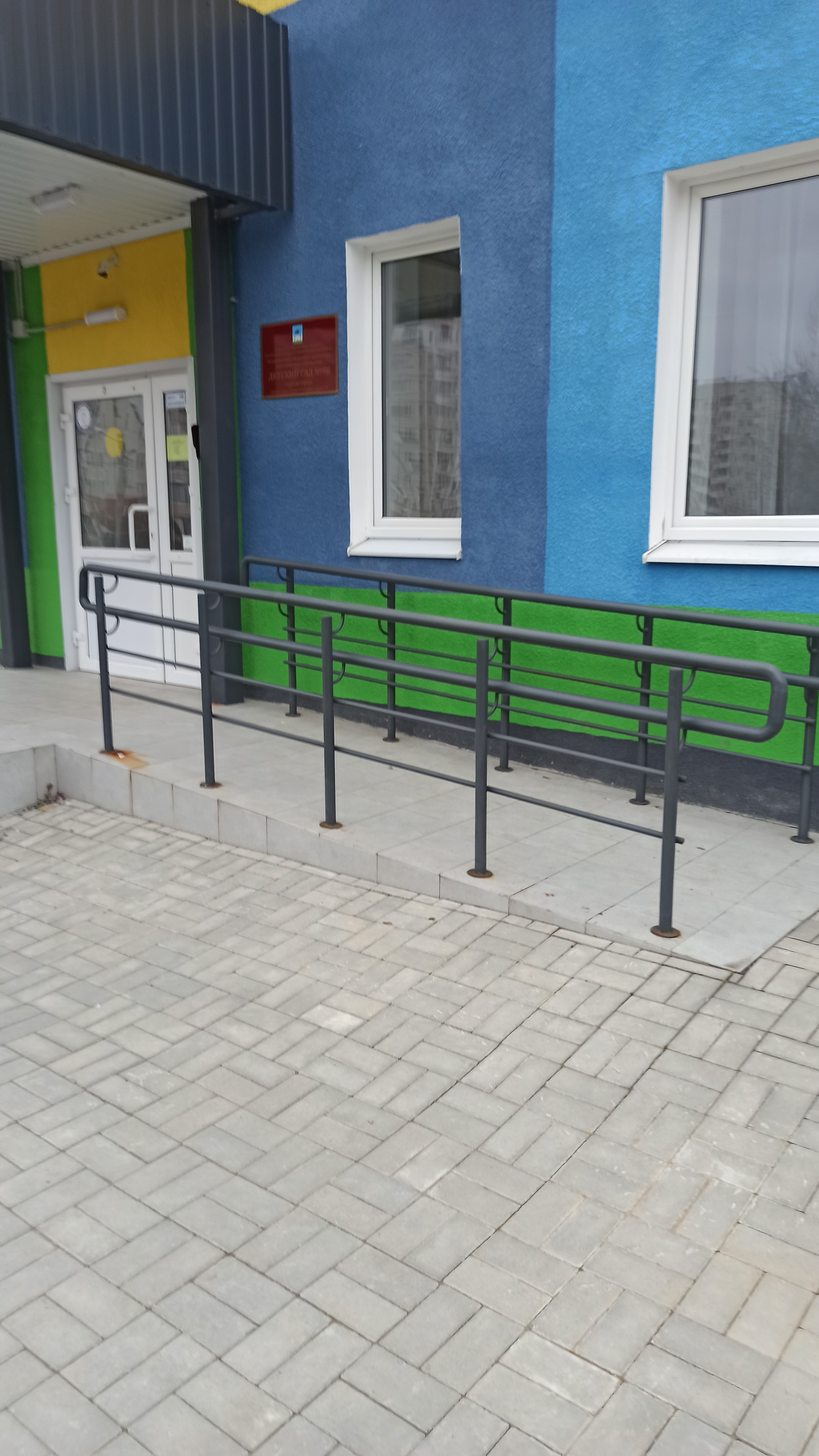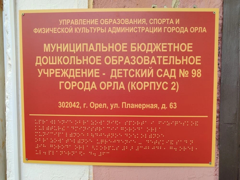 В МБДОУ № 98 г. Орла созданы условия для обеспечения беспрепятственного доступа в здание: устранены барьеры и опасные участки для инвалидов и лиц с ОВЗ; наличие пандуса к входу, входные группы расширены. Все стеклянные двери, во избежание травм, оснащены наклейкой "Желтый круг" — предупредительный знак для слабовидящих людей. В здании имеются указатели со шрифтом Брайля. Специально оборудовано санитарно-гигиеническое помещение с учетом ограниченных возможностей детей-инвалидов с нарушением опорно-двигательного аппарата с кнопкой вызова сотрудника. Перед ДОУ организована стоянка автотранспорта для инвалидов.