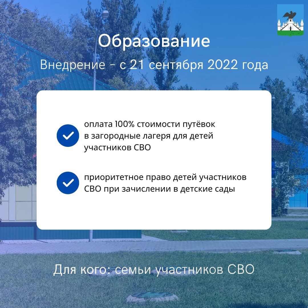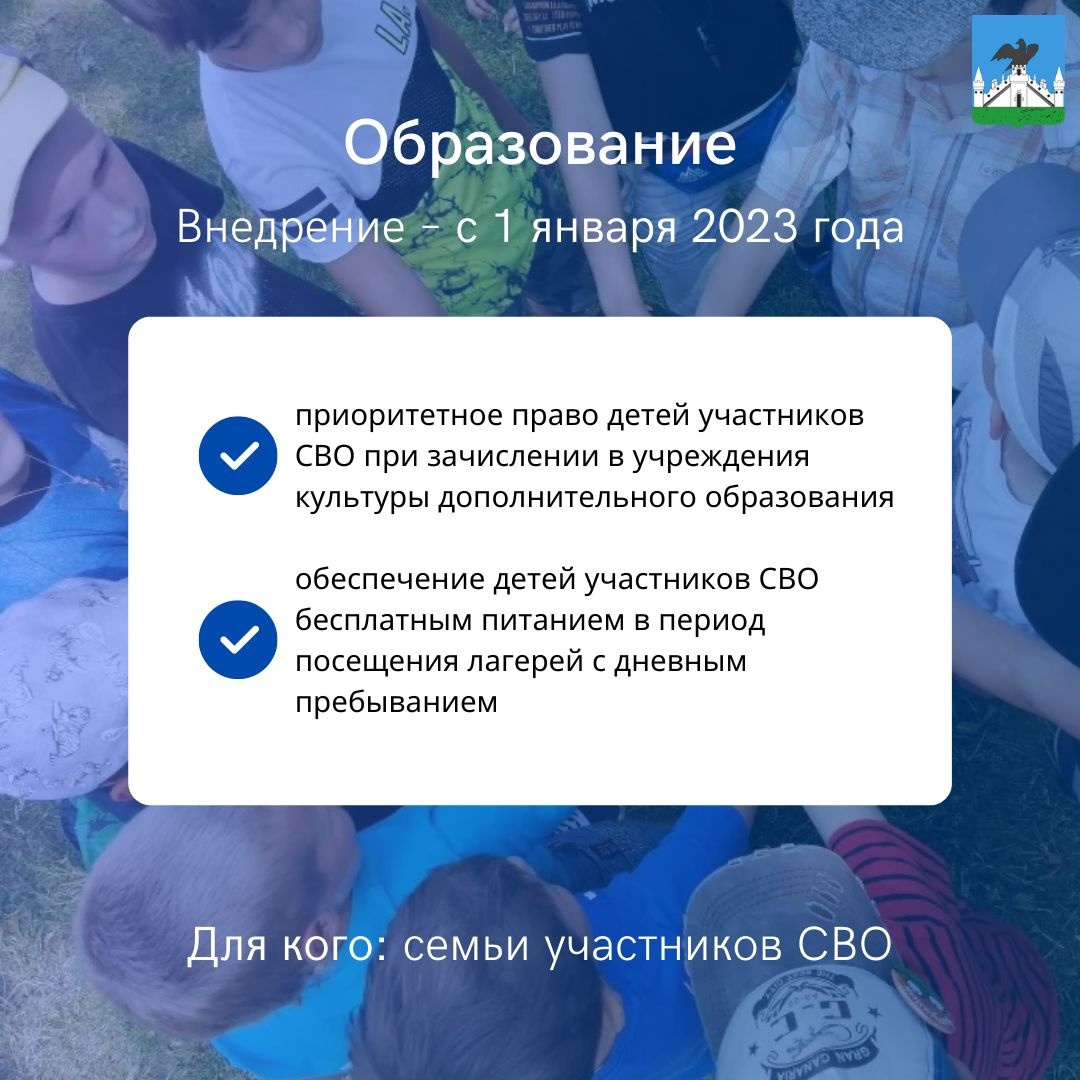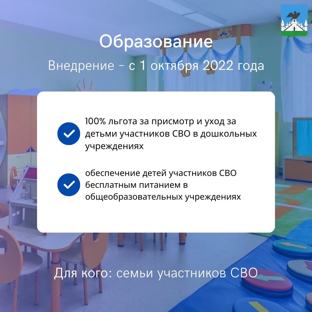 - зачисление детей участников специальной военной операции в группы продленного дня и круглосуточного пребывания в региональных и муниципальных дошкольных образовательных организациях в первоочередном (преимущественном) порядке