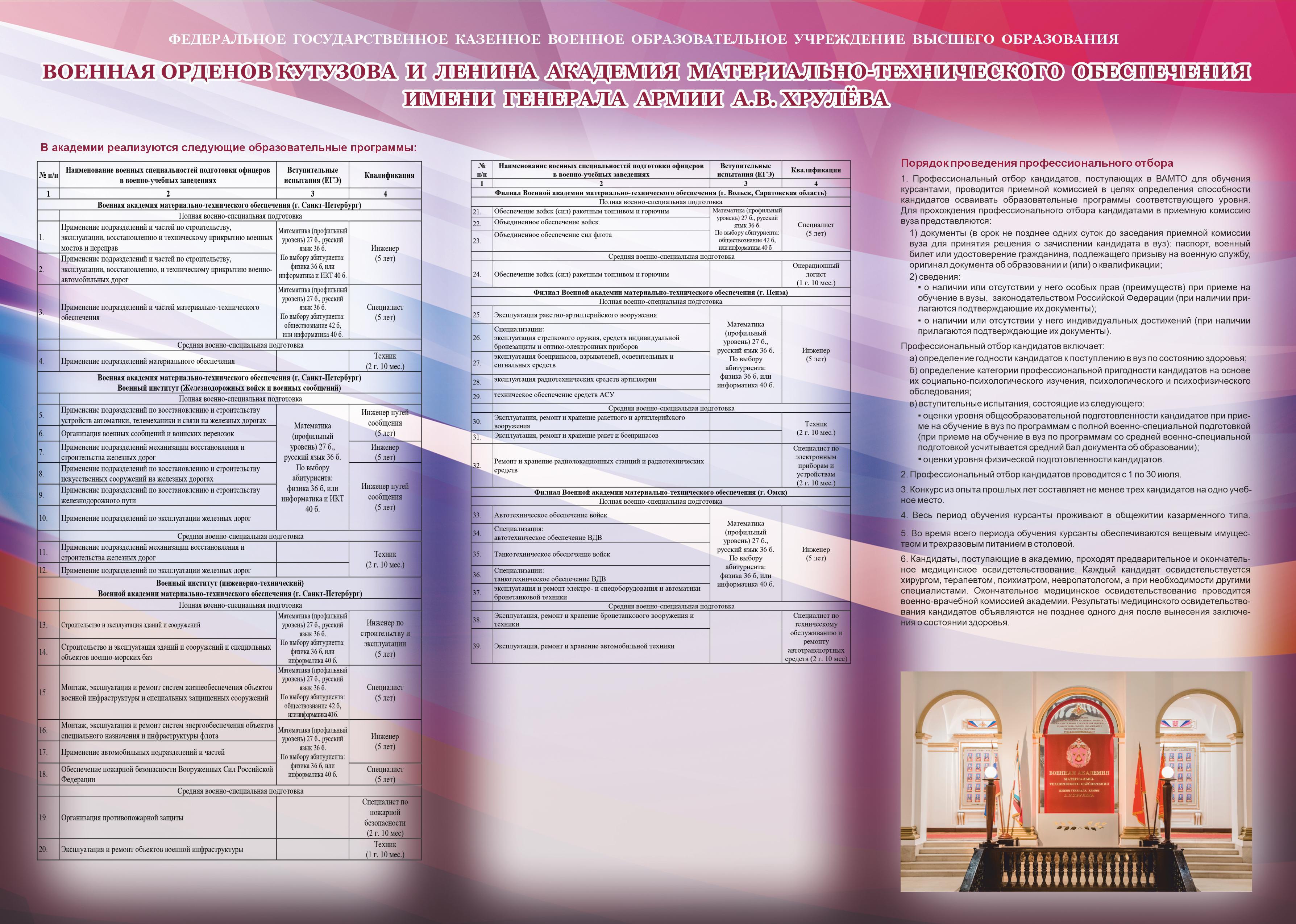 Федеральное государственное казённое военное образовательное учреждение высшего образования «ВОЕННАЯ АКАДЕМИЯ МАТЕРИАЛЬНО-ТЕХНИЧЕСКОГО ОБЕСПЕЧЕНИЯ имени генерала армии А. В. Хрулёва» приглашает абитуриентов