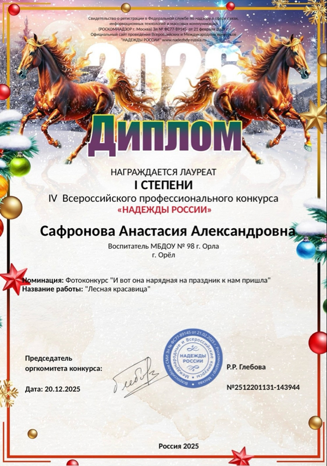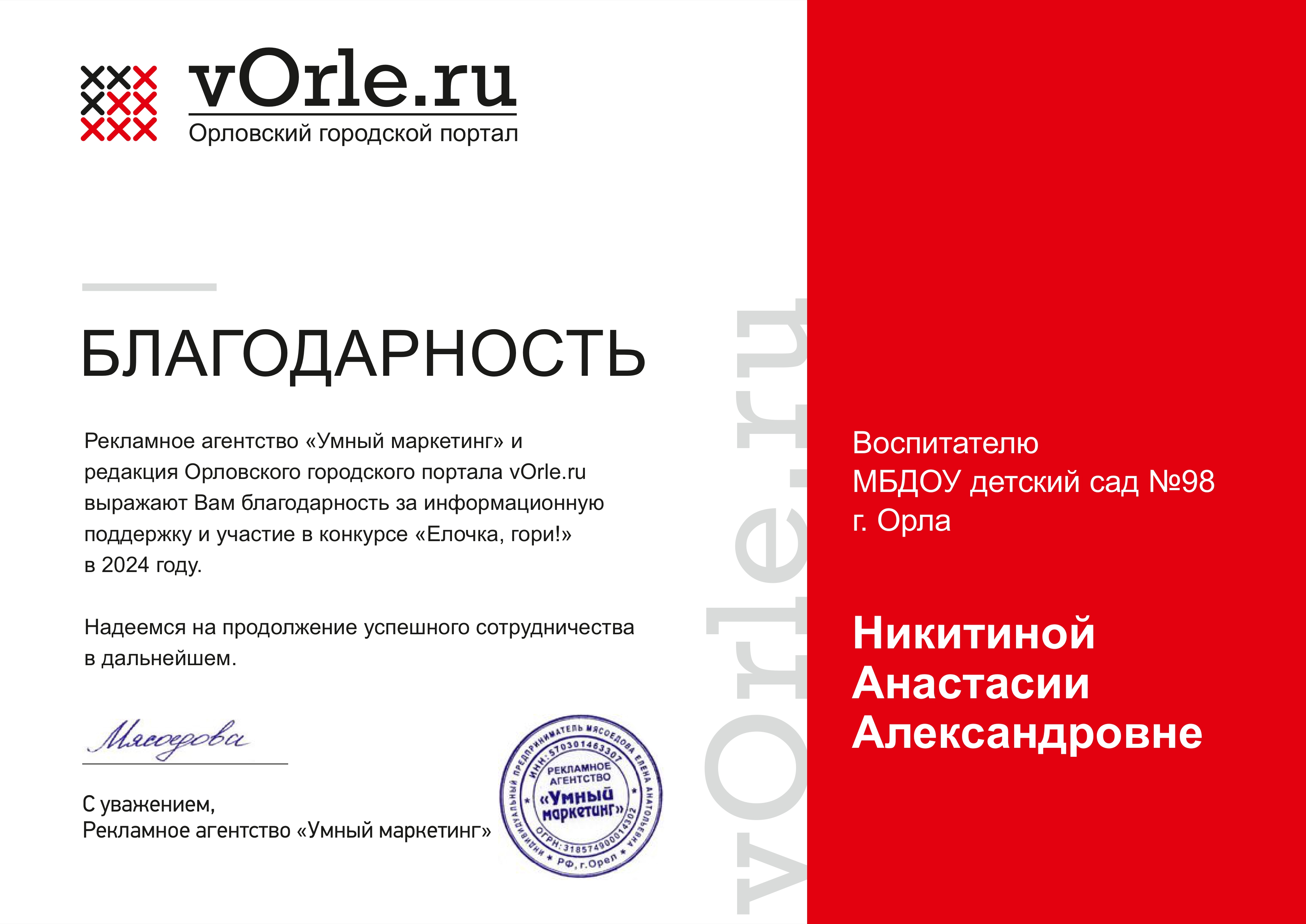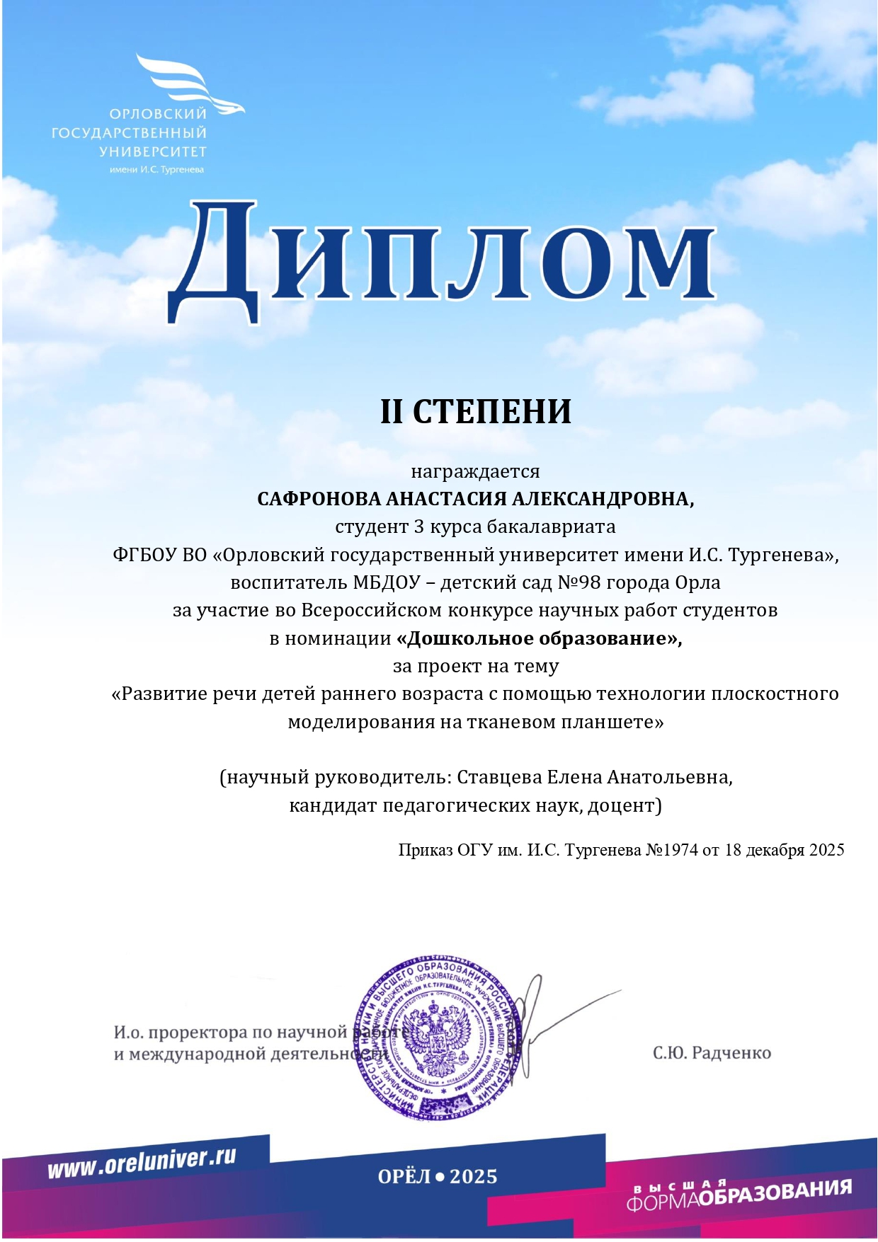 Сборник статей ФГОУ ВО "ОГУ им. И.С. Тургенева" "Актуальные проблемы дошкольного образования" выпуск 22 том IV, г. Орёл - 2024 "Актуальные проблемы в художественно-эстетическом развитии детей раннего дошкольного возраста" Сборник методических материалов ФГОУ ВО "ОГУ им. И.С. Тургенева" "Педагогическая палитра" выпуск XVI часть 3, г. Орёл - 2024 "Мастер-класс по созданию сенсорных игр для детей раннего возраста" Сборник статей ФГОУ ВО "ОГУ им. И.С. Тургенева" "Актуальные проблемы дошкольного образования" выпуск 23 том IV, г. Орёл - 2026 "Развитие эмоционального интеллекта у дошкольников: роль семьи и образовательных учреждений" Сборник методических материалов ФГОУ ВО "ОГУ им. И.С. Тургенева" "Педагогическая палитра" выпуск XVII часть 3, г. Орёл - 2026 "Конспект занятия по аппликации "Варежка для куклы Кати" для младшего дошкольного возраста"