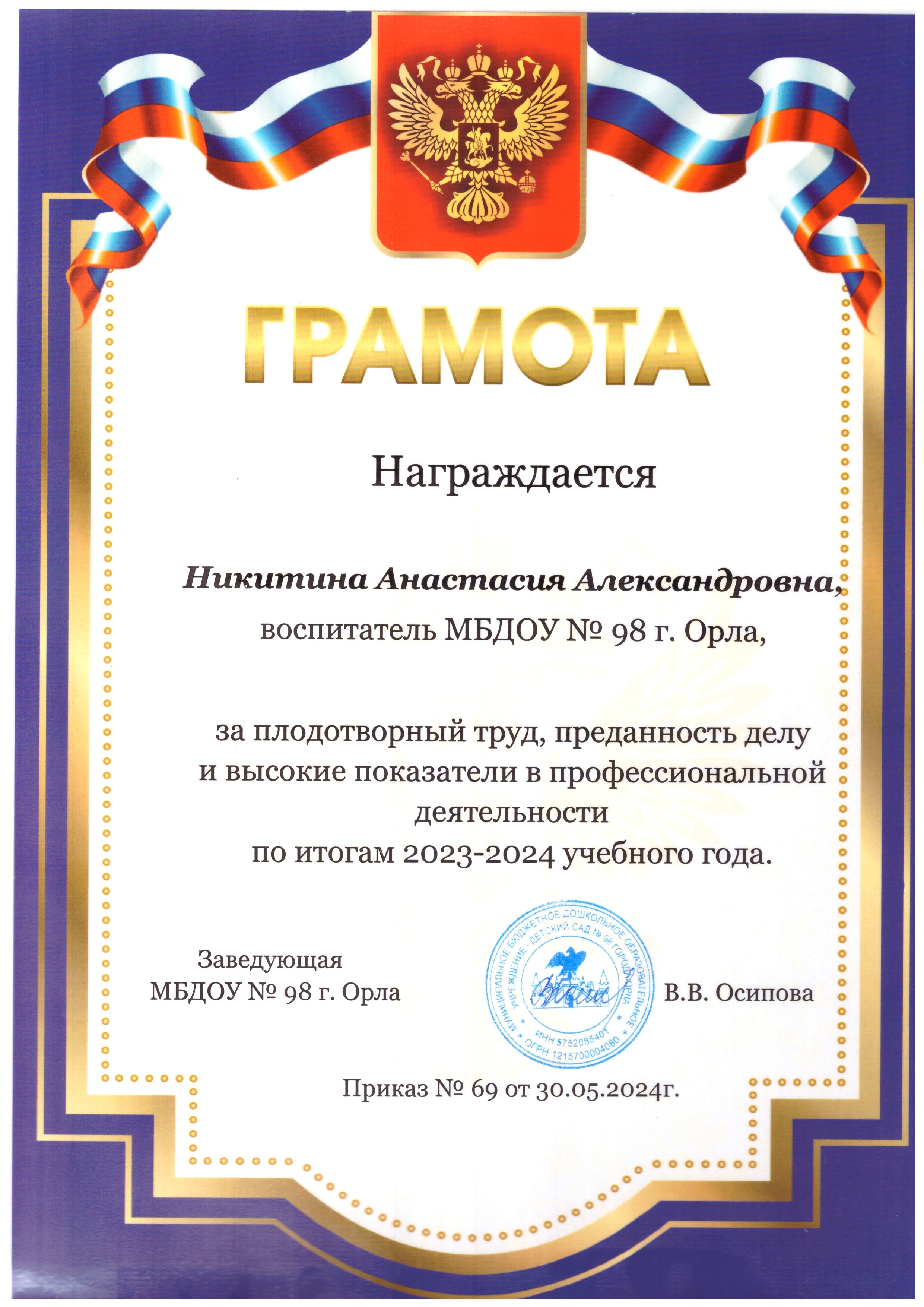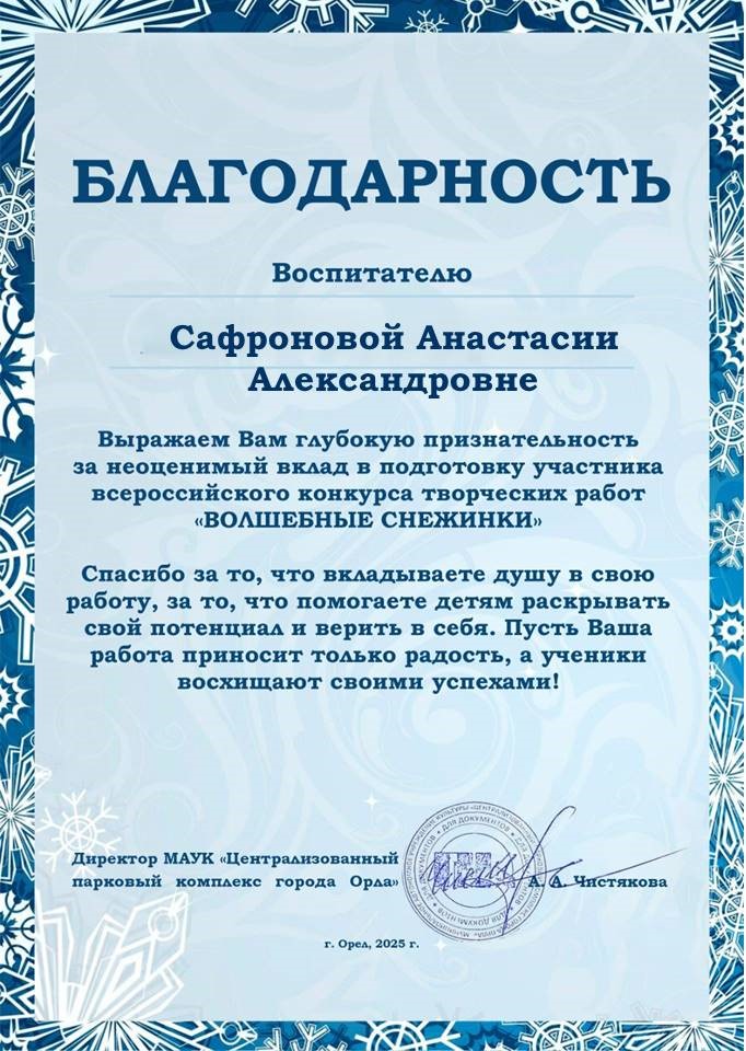 Удостоверение ПК 57 СК № 0079, "Совершенствование профессионально-значимых компетенций руководящих и педагогических кадров образовательных организаций в современной практике конкурсного движения", БУ ОО ДПО "ИРО", 16.02.2026 - 20.02.2026, 36 ч. Удостоверение ПК 57 СК № 0294, "Современные технологии развития и совершенствования профессионально-личностных компетенций молодых специалистов в образовательных организациях", БУ ОО ДПО "ИРО", 28.04.2025 - 30.04.2025, 24 ч.