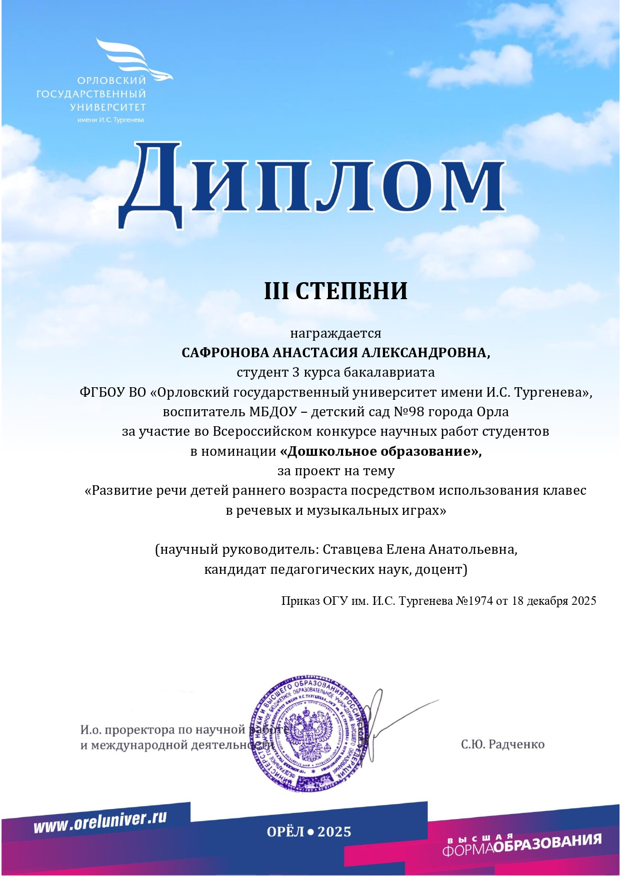 Студентка з курса ФГБОУ ВО "Орловский государственный университет имени И.С.Тургенева" по специальности 44.03.02 Психолого-педагогическое образование |